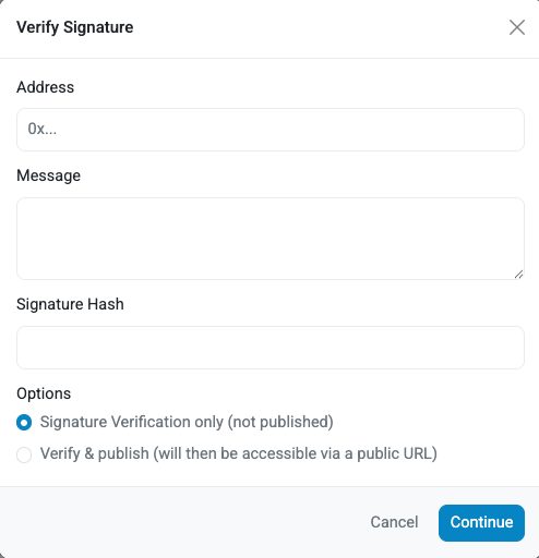 Click the Verify Signature button available on Etherscan. The Verify Signature window is displayed.