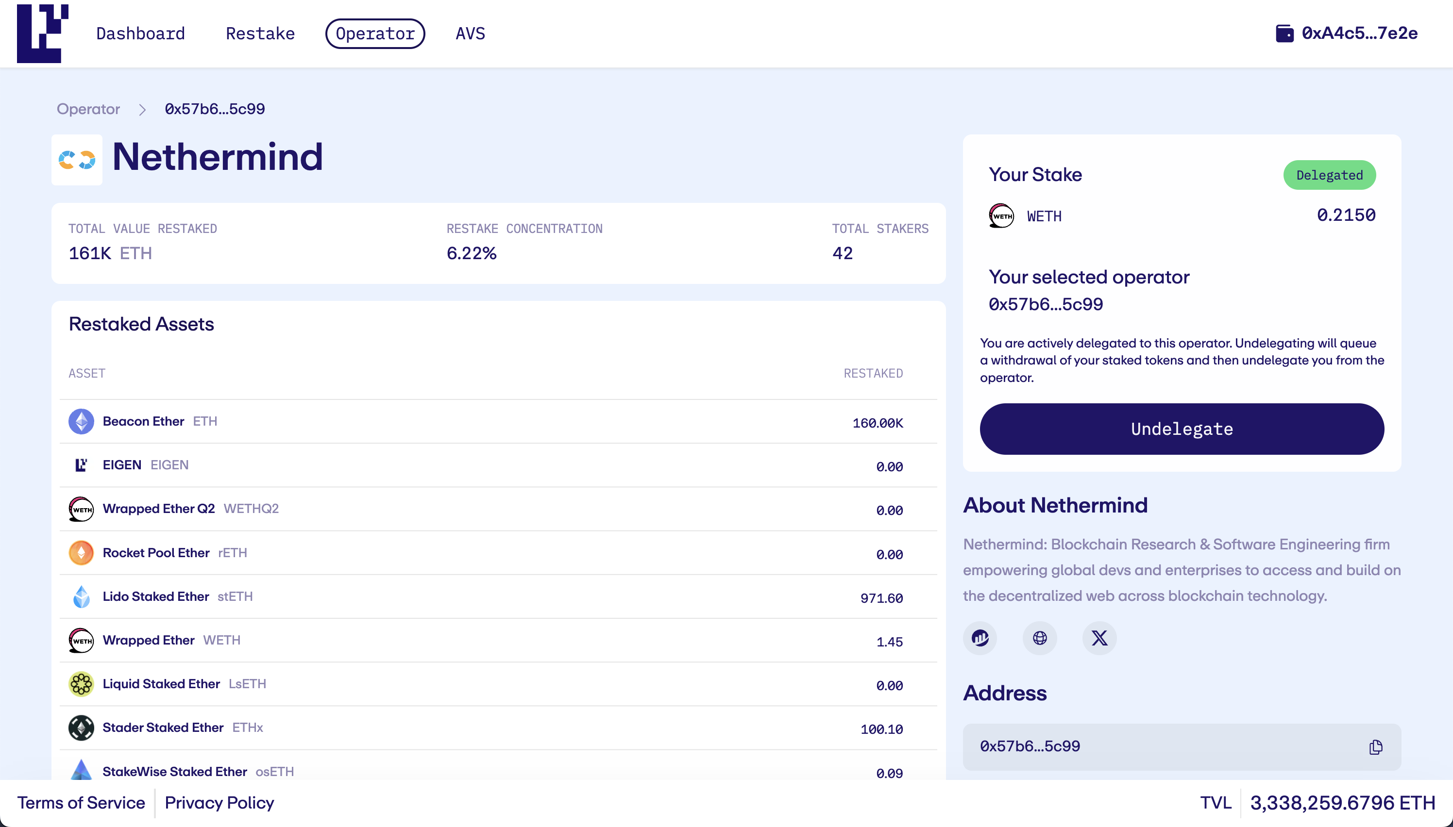 Step 1: Navigate to the Operator tab, click the tile for the Operator you have delegated your funds to. Click the Undelegate button to continue.